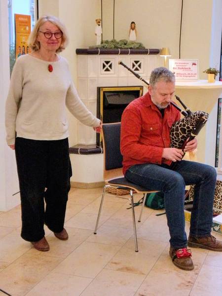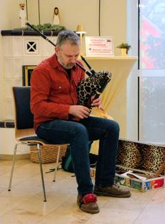 Ein besonderes Dankeschön für die fürsorgliche Pflege und Begleitung ihrer Mutter, Großmutter hat Familie Volmer Perry dem CBT Wohnhaus Edith Stein geschenkt - ein musikalischer Genuss mit dem Dudelsack von Jannik Perry und dazu leckere, französische Madelaines.