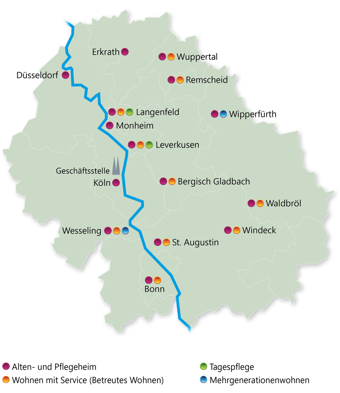 Wir sind mit 23 Einrichtungen in 15 Städten im Rheinland vertreten: Alten- und Pflegeheime mit stationärer, teilstationärer, Tages- und Kurzzeitpflege, Wohnen mit Service (Betreutes Wohnen) sowie zwei Mehrgenerationenwohnhäuser.